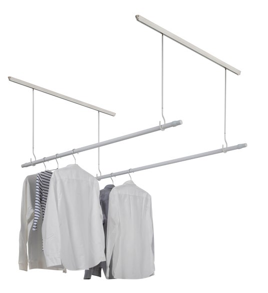 2本の物干し竿でたっぷりと洗濯物を干すことができ、使用しないときはフックを片側に寄せることで空間を有効活用できます。フックはベースから取り外すことも可能で、よりすっきりとした印象に。また、スライド機構により、物干し竿の間隔を自在に調整できるため、洗濯物のサイズや量に合わせたアレンジが可能。限られた空間でも効率よく干せる設計です。