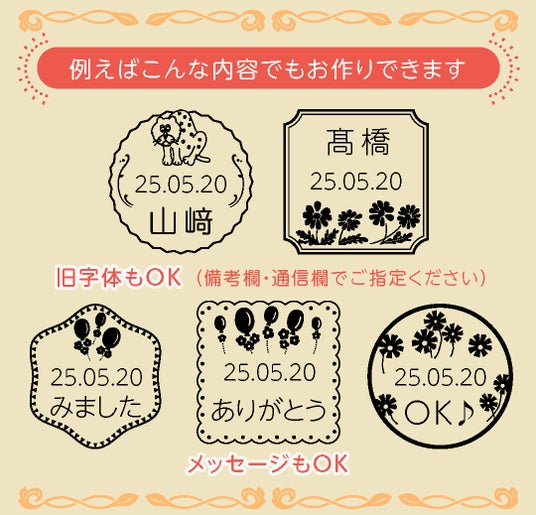 日付印は用途に応じて、好きな内容で作ることができます。上段や下段に好きな文字や名前を入れたり、空欄にしてスタンプを押したあとに手書きで書き込むことも。もちろん旧字体やメッセージでも作れます。