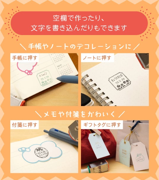 手帳に押してスケジュール管理をしたり、ノートや付箋に押してかわいく彩ったり、ギフトタグに押したりetc..、アイデアしだいでいろんな楽しみ方が可能です。