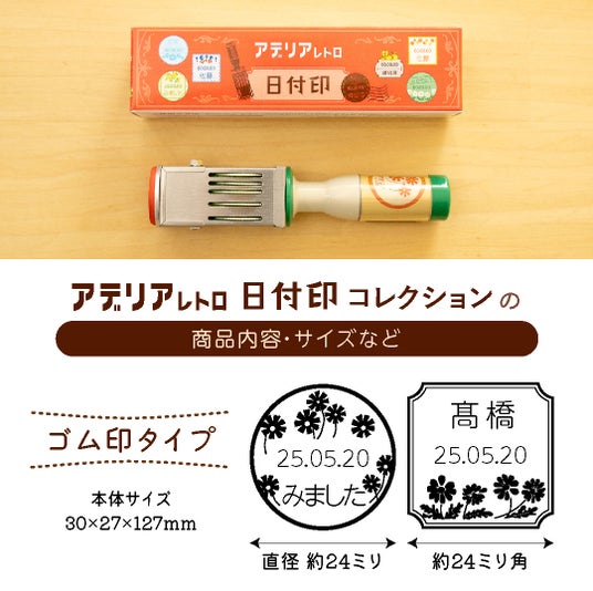 日付印本体のサイズは横30×縦27×高さ127ミリ。印面サイズは丸形・角形ともに約24ミリ。スタンプ本体の持ち手部分や専用BOXにも、アデリアレトロのかわいいモチーフがあしらわれています。