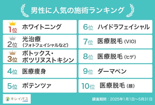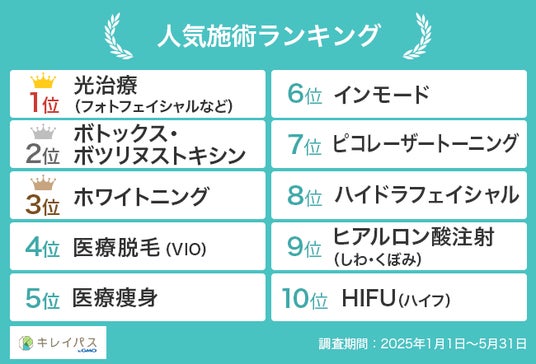GMOインターネットグループのGMOビューティー株式会社(本社:東京都渋谷区、代表取締役社長:高橋 良輔)が運営する、美容医療の検索・予約サービス「キレイパス byGMO」(https://kireipass.jp/)は、同サービスの利用者のデータに基づき、「2025年上半期 美容医療人気ランキング」を発表いたします。