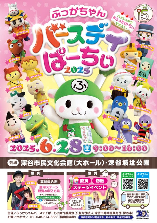 深谷市(埼玉県深谷市、市長:小島進)は6月28日(土)ふっかちゃん誕生15周年記念「ふっかちゃんバースデイぱーちぃ2025」を開催しました。約4,000人のファンが県内外から来場。深谷市民文化会館 / 深谷城址公園をメイン会場に行われたバースデイイベントは大盛況となりましました。