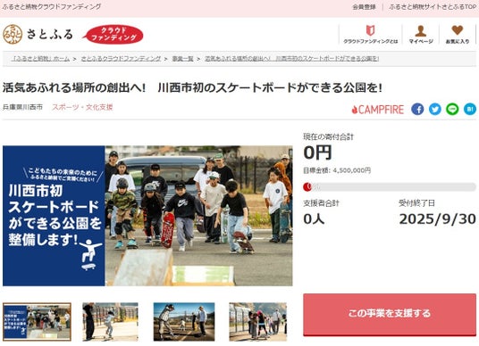 兵庫県川西市とふるさと納税ポータルサイト「さとふる」を運営する株式会社さとふる(本社:東京都中央区、代表取締役社長 兼 CEO:藤井 宏明)は、「さとふるクラウドファンディング」にて、「活気あふれる場所の創出へ! 川西市初のスケートボードができる公園を!」の寄付受け付けを2025年7月1日より開始します。