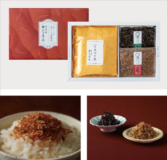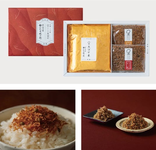 京都で創業、チリメン山椒の製造・販売を行うたきものゑびす(株式会社たきものゑびす 本社:京都市上京区、代表取締役:晴間 茂)は、江戸時代後期に同じく京都で創業した⽼舗米屋であり、お米のトータルプロデュース事業を展開する八代目儀兵衛(株式会社八代目儀兵衛 本社:京都市下京区、代表取締役社長:橋本 儀兵衛)のお米から厳選し、チリメン山椒ごはんの贅沢なセット商品【名匠のチリメン山椒ごはんギフトセット】を発売いたしました。