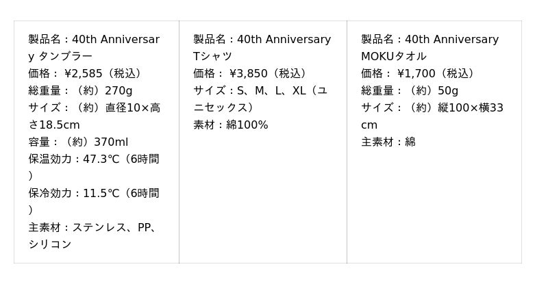 「40th Anniversary Tシャツ」は、吸水性・通気性に優れた綿100%のTシャツ。繰り返しの洗濯にも耐えうる強度を持つ、丈夫で長持ちする素材を採用。生地が透けず、型崩れしにくいため、ビーチやフェスなどのアウトドアシーンのほか、日常使いにも最適。カラーはブラックで、胸元と背面に40周年オリジナルロゴをプリントしたデザイン。また、サイズはS~XLサイズと幅広く展開し、ユニセックスのため、家族お揃いで着用可能。