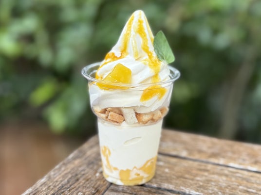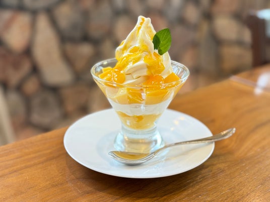 バニラソフトクリームに、とろけるマンゴープリン、ソースをたっぷりトッピングし、濃厚でありながら後味はスキッリなパフェです。