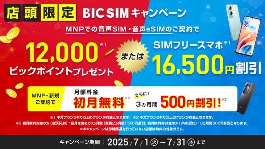 【BIC SIM】ビックカメラグループ店舗での申込みでSIMフリースマホが16,500円割引、またはビックポイントを12,000ポイント還元