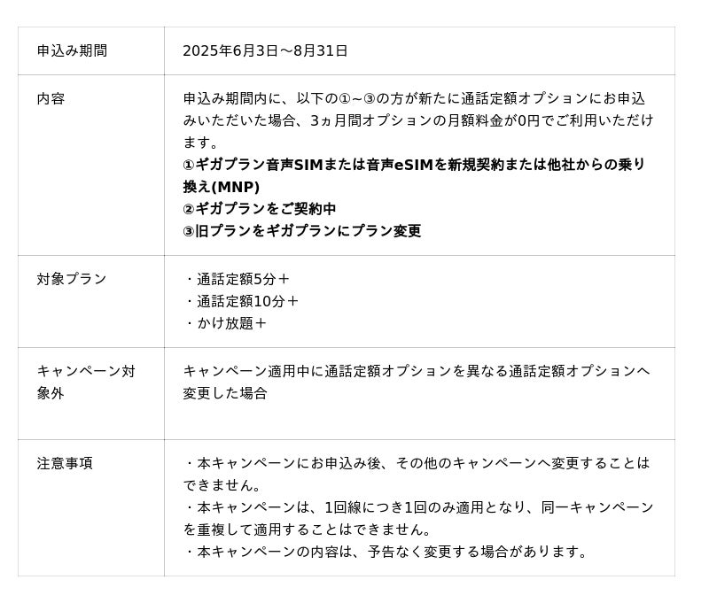 店舗・WEB共通でギガプランの月額料金が3ヵ月間最大500円割引、通話定額オプションが3ヵ月間0円で利用できる「BIC SIMサマーキャンペーン」も2025年8月31日まで実施中です。
