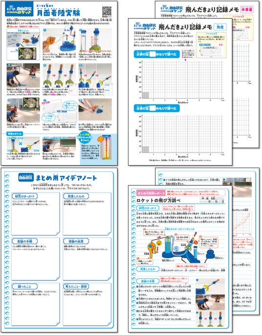 ▲左上:自由研究のやり方シート、右上:記録メモシート、左下:まとめ用アイデアノート、右下:まとめ方実例レポート(「水素エネルギーロケット…データを集めて月面着陸実験」より)