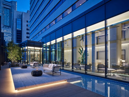 みなとみらいの上空に停泊したホテルをイメージし、クルーザーの持つ曲線や素材感をモチーフにしたデザインで、ロビー階は"船舶デッキ"、客室を"キャビン"として設計。20階のパブリックエリアには、スカイプールやレストラン、サロンなど、多彩な施設が集積し、みなとみらいエリアを見渡す抜群の眺望とくつろぎの空間をご提供します。