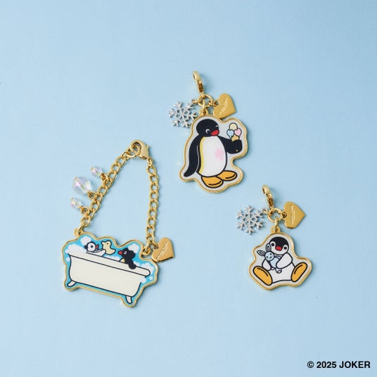 バッグチャームは、ピングーとピンガが仲良くお風呂に入っている可愛らしいアートを金具に落とし込んだデザイン。