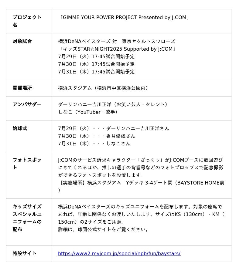 横浜DeNAベイスターズのオフィシャルスポンサーである株式会社ジェイコム湘南・神奈川(所在地:神奈川県横浜市、代表取締役社長:京克樹)は、2025年7月29日(火)から7月31日(木)の3日間に横浜スタジアムにて行われる、「キッズSTAR☆NIGHT2025 Supported by J:COM」のイベントスポンサーとして、冠試合を開催します。