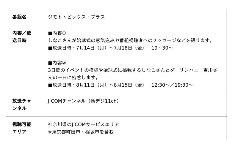 また、株式会社ジェイコム湘南・神奈川は「J:COM CUP学童軟式野球大会」の毎年開催を通じて地域の子どもたちのスポーツ振興に寄与しております。イベント2日目の7月30日(水)は、昨年度「J:COM CUP学童軟式野球大会(ブルーリーグ)」で優勝した「鎌倉レッドサン」(神奈川県鎌倉市)優勝メンバー、香月優成選手が始球式に挑みます。