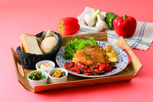 「もったいない野菜」のトマトやパプリカを炒め煮した彩り豊かなチリンドロンソースと、ジューシーな鶏もも肉のソテーがマッチしたひと皿。