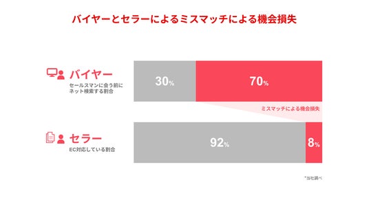 他方、業界全体に目を向ければ、エンドユーザーの行動変容への対応の遅れが目立ちます。商品選定をするバイヤーの70%は営業担当にコンタクトする前にまずネット検索をする一方、販売する側のEC対応(受注システム、通販出店など)は8%にとどまるため、ミスマッチによる多大な機会損失が発生しています。