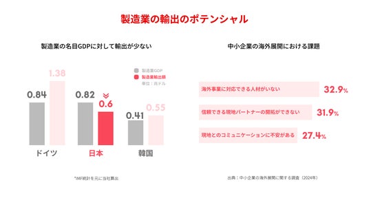 海外販路拡大に関しては、経済産業省レポート『成長投資が導く2040年の産業構造』(2025年4月)で、輸出促進による売上向上を図るべきとの提言がありました。日本の製造業はそのGDP規模が近いドイツや韓国に比べ、輸出額が少なく海外展開はまだまだポテンシャルがある領域です。一方、中小企業においては海外事業に対応できる人材不足やコミュニケーションの課題を克服できておらず、その可能性を活かしきれていません。
