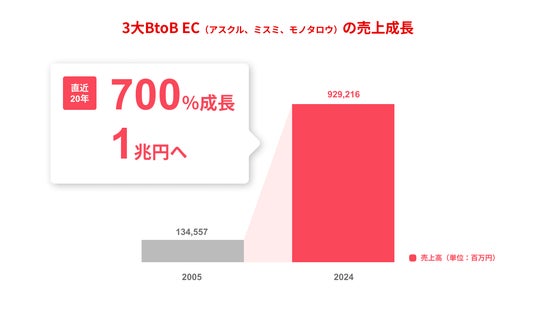 3大BtoB ECであるアスクル、ミスミ(vona)、モノタロウの売上はこの20年で700%成長し、1兆円規模に近づいています。