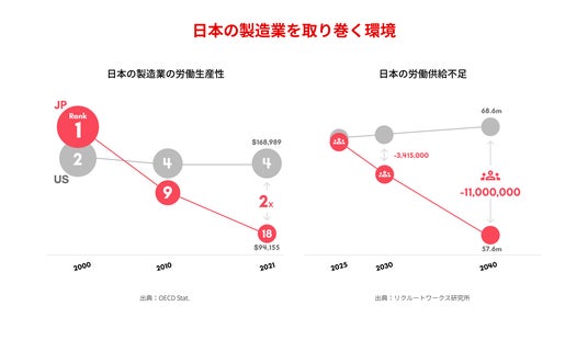 日本の製造業を取り巻く環境は厳しさを増しています。その労働生産性は2000年1位から2021年18位と下落し続け、米国との差は2倍に近づいています。労働生産性は労働投入量(労働者数 x 労働時間)を分母、付加価値額(もしくは生産量)を分子に計算されます。極端に考えれば、労働時間を半分で同じ仕事量をこなすか、売上を2倍にしなければ追いつくことができません。