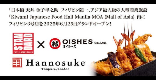 人気飲食店、つけ麺「つじ田」や「日本橋 天丼 金子半之助」「中華そば専門 田中そば店」などをグループで運営する、オイシーズ株式会社(本社:東京都 千代田区 、代表取締役 工藤 智、以下「当社」)は、フィリピンで人気のとんかつレストラン「Yabu House of Katsu」や複数の日系飲食企業とライセンス(FC)契約し本格的な日本食レストランを多店舗展開するStandard Hospitality Groupと共に、2025年6月25日(水)フィリピン首都マニラ南部パサイ市にあるアジア最大級の大型商業施設「SM Mall of Asia」(通称:MOA)内の「Kiwami Japanese Food Hall 」に、フィリピン3号店となる、「Hannosuke (日本橋 天丼 金子半之助)Kiwami Japanese Food Hall Manila MOA 店」(以下、MOA店)を出店いたしました。