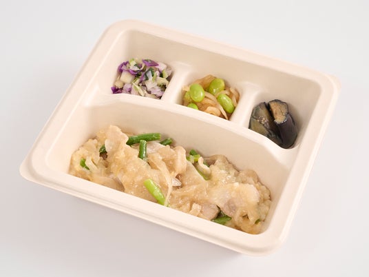 副菜は、さっぱりやみつきのキャベツの塩だれ、シャキシャキ食感の大根の甘酢あえ、揚げなすのコクに生姜の香りがベストマッチのなすの生姜醤油です。
