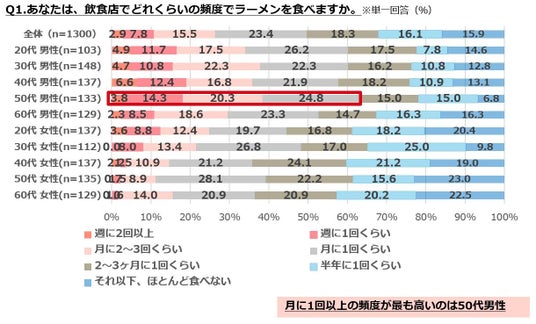 ・飲食店でラーメンを食べる頻度は「月に1回くらい」が23%、「2~3ヶ月に1回くらい」が18%で、月に1回以上の頻度が最も高いのは50代男性。