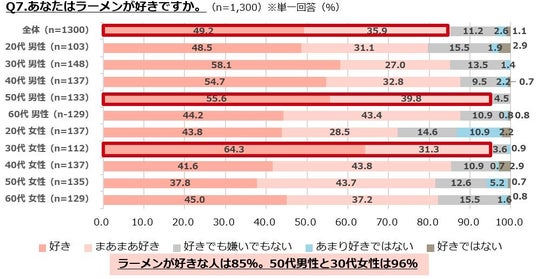 ・ラーメンが好きな人は85%で、50代男性と30代女性では96%と高い。