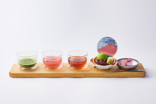 創業480年の歴史を持つ「京都宇治 藤井茶園」の上質な茶葉を使用したお茶やお食事が楽しめる「藤井茗縁」。葛飾北斎の浮世絵をあしらったラテや甘味を、展示会の余韻とともにお楽しみください。