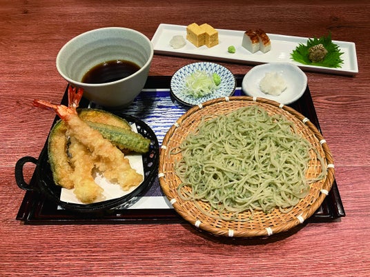 江戸前の伝統を守りつつ、蕎麦本来の美味しさを追求した二八そばを提供する「手打ちそば 竹之内」。本展とのコラボメニューでは、国内さらしな粉と刻んだシソの葉を手打ちにした自家製しそ切りそばをご提供します。プリプリの海老2尾と夏野菜をカラッと揚げた天ぷらと一緒にお召し上がりください。