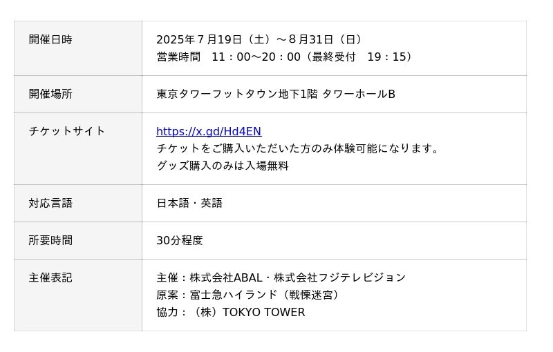 そして、2025年7月19日(土)~8月31日(日)までの期間限定で、東京タワーフットタウン地下1階 タワーホールB(東京都港区芝公園4丁目2-8)にて開催することが決定いたしました。