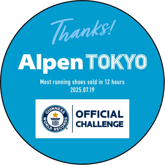 ギネス世界記録(TM)挑戦当日Alpen TOKYO 1階にて、該当のランニングシューズをお買い上げで、ギネス世界記録(TM)挑戦特製ステッカーをご用意しております。