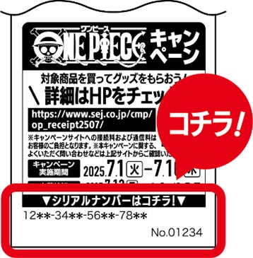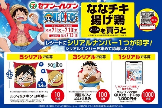 計10日の期間中、セブン‐イレブンで「ななチキ」・「揚げ鶏」(※1)どちらかを購入すると、シリアルナンバー付きレシートが発行され、オリジナル"ルフィ"グッズやQUOカード Payが当たる抽選に応募できます。