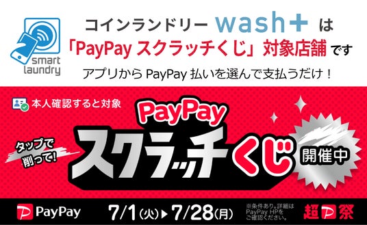 株式会社wash-plus(本社:千葉県浦安市、代表取締役:高梨健太郎)が運営する「コインランドリーwash+(ウォッシュプラス)」は、2025年7月1日(火)~7月28日(月)に実施される「PayPayスクラッチくじ」の対象店舗です。