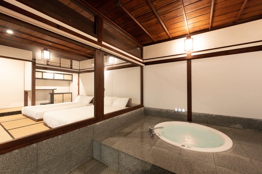歴史ある古民家を改装した和洋室タイプの客室。ジャグジー風呂や縁側でのんびりとした時間を楽しめる、落ち着いた大人の隠れ家です。