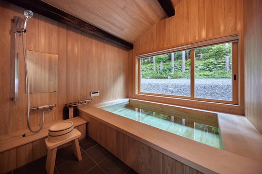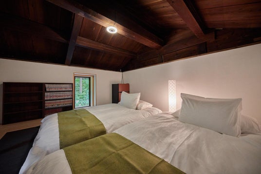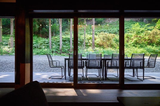 モダンな家具と古くからの木の部材を組み合わせ活かした空間設計は、洗練されつつも歴史の重厚感を感じさせます。大開口の窓の外には緑豊かな山々の景色が広がり、四季折々の風景が室内からも楽しめるように設計されています。室内外の空間をつなぎながら、グループや家族のそれぞれが自分らしく過ごせる工夫が随所に施されています。