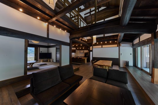 有田邸は歴史ある古民家を丁寧にリノベーションした現代的な快適さと伝統的な日本家屋の美しさを融合させた一棟貸しの貸別荘になります。コンセプトは「田舎暮らしをもっと身近に簡単に」。LDKは約20畳の広さで、梁を活かした高天井と柔らかな照明が、ゆったりとした時間の流れを演出します。