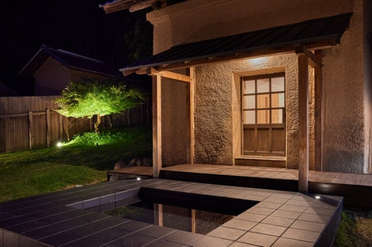 施設の敷地内には、かつての土蔵を活かして再生された「蔵サウナ」を併設。蔵の正面にはタイル張りの水風呂を設置。土壁の重厚感ある外観と、現代的な設備を融合させた特別な空間です。