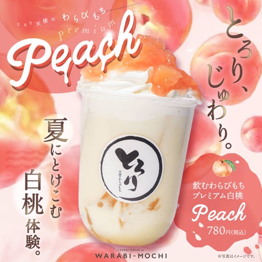 白桃の優しい甘さがとろける、夏限定ご褒美ドリンク。ミルクでまろやかに仕上げた「プレミアム白桃」と香り高い紅茶に白桃の甘さを重ねた「プレミアム白桃ミルクティー」。とろとろのわらびもち入りでとろとろ食感と果実感を楽しめる一杯に仕上げました。ホイップと白桃果肉入りソースで贅沢にトッピングし、桃好きにはたまらない味わいです。