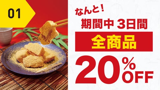1.全商品20%OFF!!期間中の3日間は生わらびもちだけでなく、飲むわらびもちやクリームわらびもちも含めた全商品が20%OFFで購入できます。