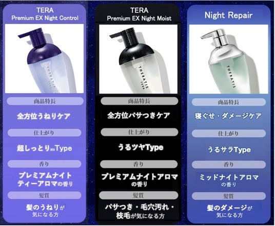 2021年9月に「寝ぐせ・ダメージケア」に特化した『セラティス ナイトリペア』、2023年10月に「地肌・うねりケア」に特化した『セラティス ムーンライト スリーク』、2024年9月に枝毛やパサつきなど毛髪全般の悩みにアプローチするプレミアムライン『セラティス テラ プレミアム EX ナイト モイスト』を発売いたしました。そして2025年7月に全方位うねりケアを提案する『セラティス テラ プレミアム EX ナイト コントロール』を発売いたします。