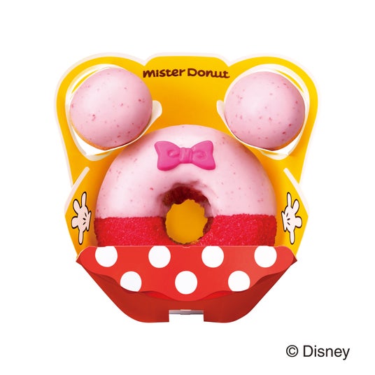 キャラメルフレーバーのふわふわシュードーナツ生地にストロベリーチョコをコーティングし、りんごシュガーでイメージカラーを再現しました。ポン・デ・ストロベリーボールとピンクのリボンをトッピングしてミニーマウスデザインのドーナツが完成です。