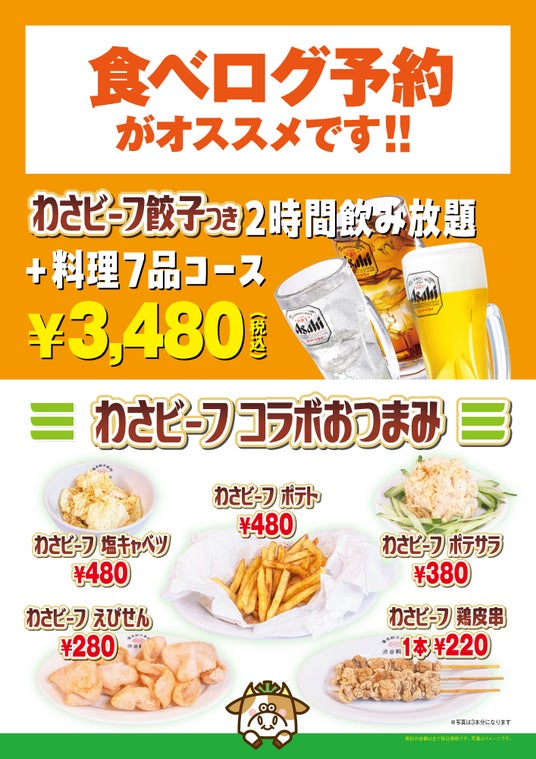 わさビーフ餃子含む料理を楽しみながら、2時間飲み放題を満喫できる期間限定のコースプランも用意しております。混みあいますので、食べログからのご予約が大変おすすめです。また、当コースご利用の方から先着300名様(各店100枚)に、限定ノベルティ(A4クリアファイル&ミニステッカー)をプレゼントいたします。