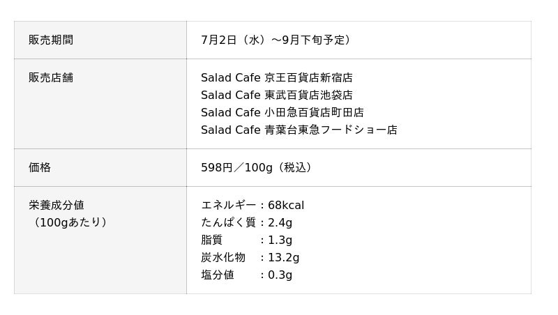 サラダカフェは、今回発売するフレッシュな味わいのサラダで、暑い日が続くこの季節の食卓に涼やかなひとときを提供します。今後も、サラダを通じて、お客様の笑顔と健康をサポートしてまいります。