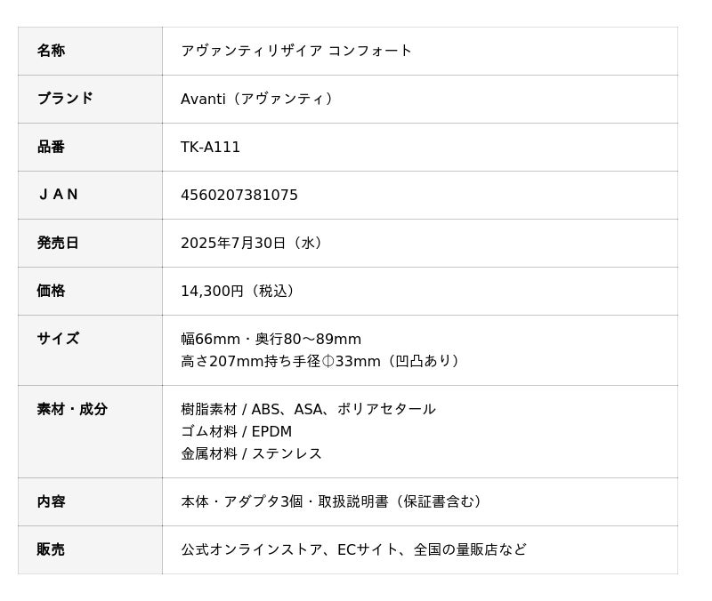 TK-A111 アヴァンティリザイア コンフォート / 2025年7月30日(水)新発売
