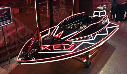 RED°TOKYO TOWER 1F ボートレースエリアに設置されている「RED゜TOKYO TOWER コラボボート」を展示します。さらに、夜になるとライトアップされます。ボートは、乗艇して写真を撮ることもできます。