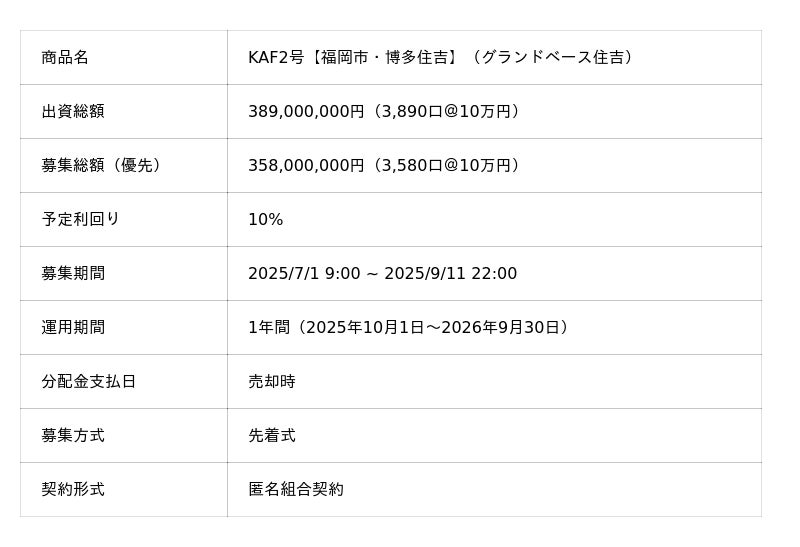 九州・アジア・パートナーズ株式会社(本社: 福岡県福岡市中央区 代表取締役:小城 雅弘)は、当社が運営する不動産投資クラウドファンディングサービス『九州・アジア・ファンディング(通称『KAF』:カーフ)』において、短期1年運用・10%の高利回りファンド『KAF2号【福岡市・博多住吉】(グランドベース住吉)』を本日7月1日(火)より募集開始開始いたしますのでお知らせいたします。出資総額は389,000,000円、募集総額(優先)は358,000,000円、想定利回りは10.0%を予定しております。