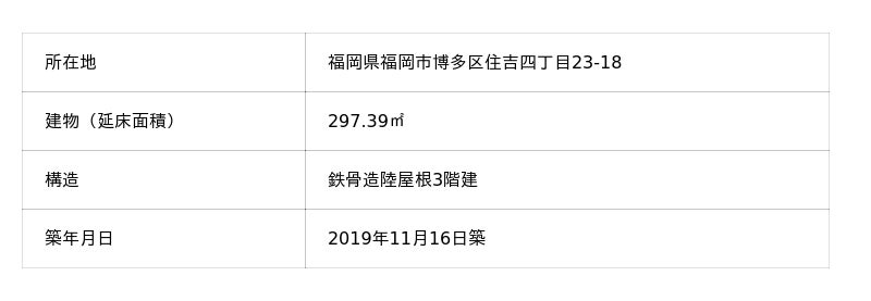 本ファンドはJR博多駅からタクシーで約6分(徒歩約17分)、徒歩圏内に大型商業施設「キャナルシティ博多」や、格式ある神社として知られる「住吉神社」があり、国内外からの観光客、ビジネス客にも支持される注目を集めている、福岡でも人気の高い住吉エリアの建物です。