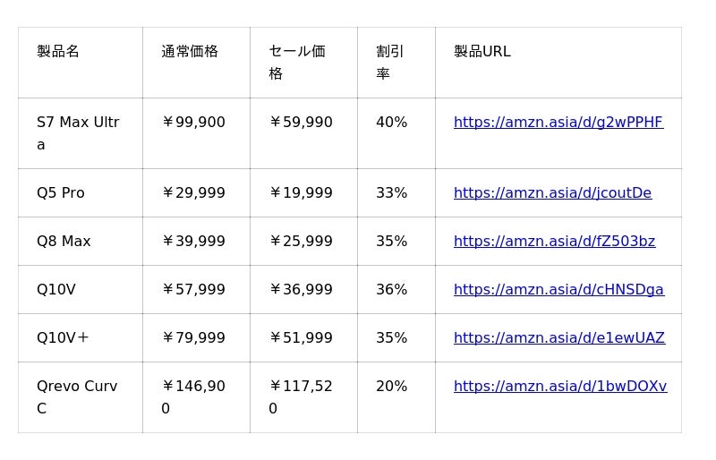 今回のAmazonプライムデーでは、Roborockの人気製品である四隅に伸びるサイドブラシと壁キワ用モップを搭載し、進化を遂げて驚異の清掃力を実現した「S8 Max Ultra」を約42%オフの113,550円(税込)の特別プライスでご用意しております。また、今年6月中旬新発売の先進ナビゲーションで驚くほど薄く、パワフルなフラッグシップモデルの超薄型ロボット掃除機「Saros 10R」を約33%オフの179,800円(税込)、性能と機能を充実させ、コンパクトな全自動ドックを搭載したロボット掃除機「Qrevo L」を約33%オフの99,800円(税込)、Roborock史上最もコンパクトなボディサイズながら、パワフルな吸引力を誇る「Q7B+」を約34%オフの45,800円(税込)にて販売いたします。Roborockは快適でスマートな掃除を実現するロボット掃除機で、皆様の生活をサポートします。
