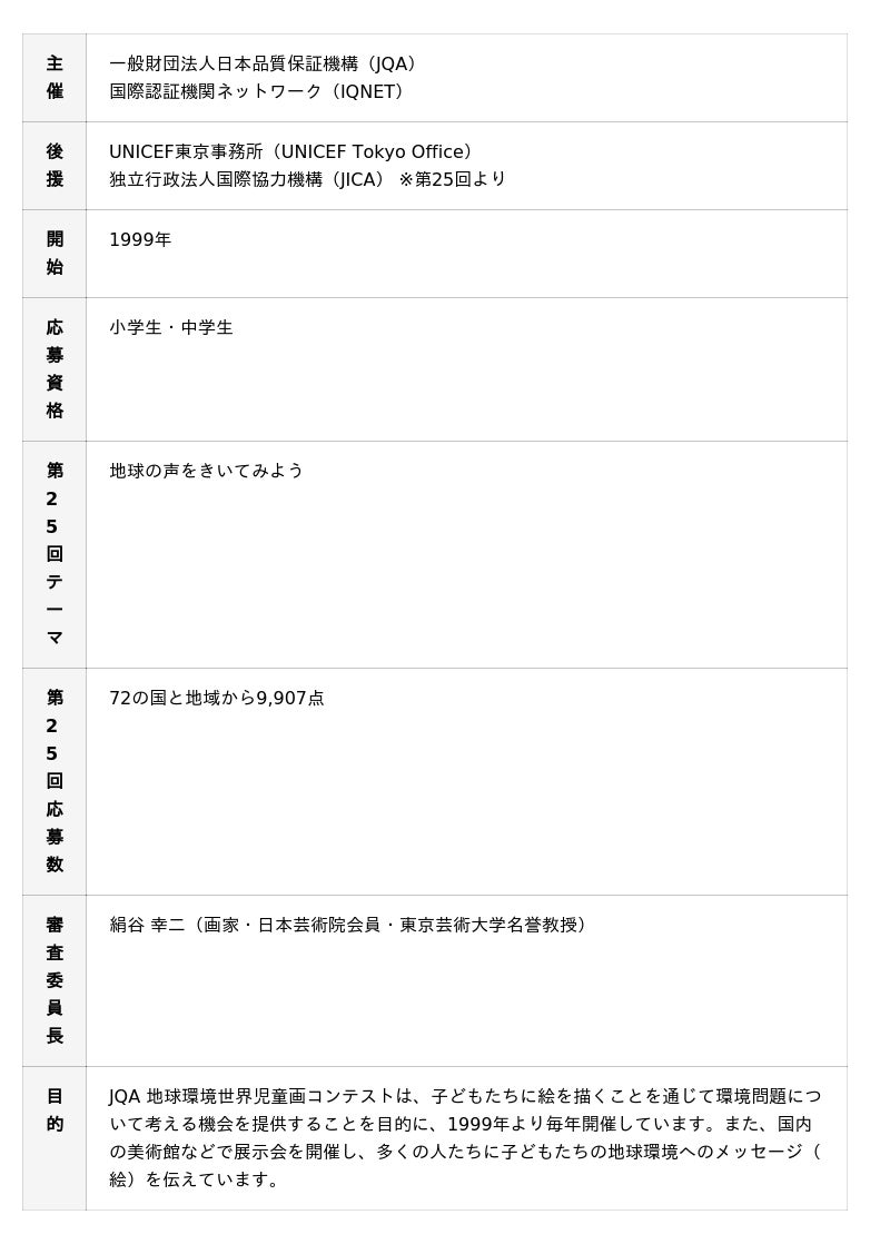 一般財団法人日本品質保証機構(東京都千代田区、理事長:石井 裕晶、略称:JQA)と国際認証機関ネットワーク(スイス・ジュネーブ、略称:IQNET)が主催し、UNICEF東京事務所(東京都渋谷区)の後援による「JQA地球環境世界児童画コンテスト」は、1999年より開催しております。