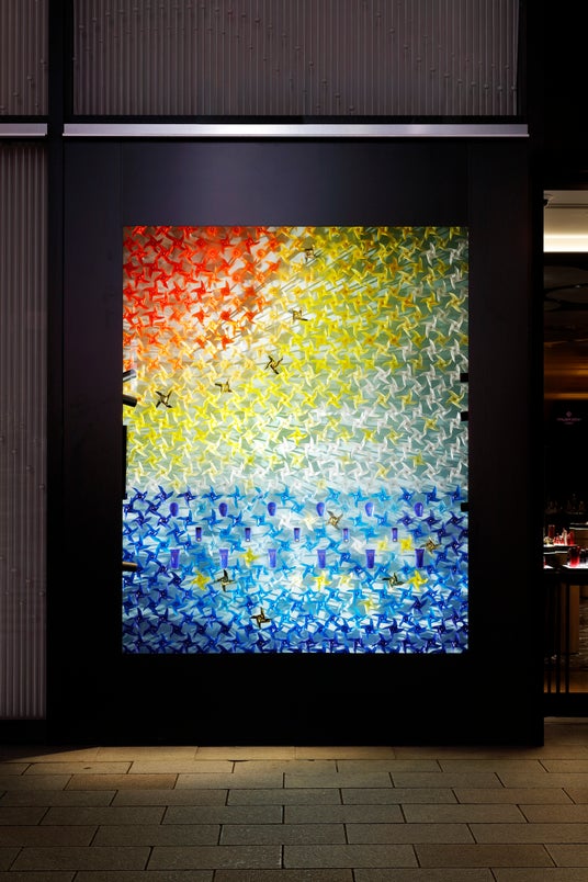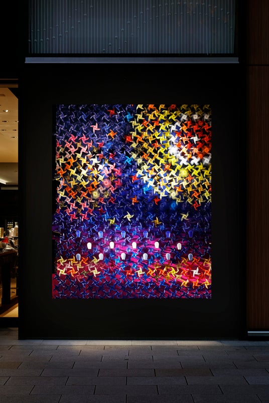 かざぐるまを用いて「日本の夏の日差し」と「夏の夜空を彩る花火」を表現。楽しい夏のひとコマを左右のウインドウで演出いたします。送風機で15秒ごとに色とりどりの羽を回転させる演出で、道行く人々に一服の涼をお届けします。色とりどりのかざぐるまが、夏の銀座の街を華やかに彩ります。
