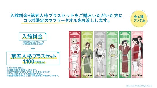 店舗ご入館時に、入館料金と第五人格プラスセットをご購入いただいた方に、コラボ限定のマフラータオルをランダムでお渡しします。